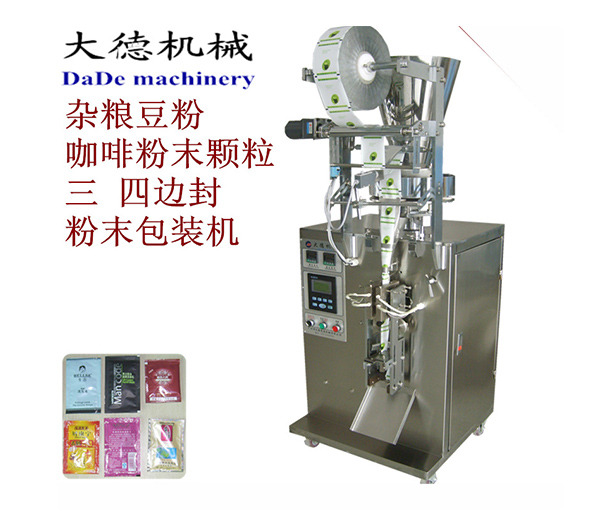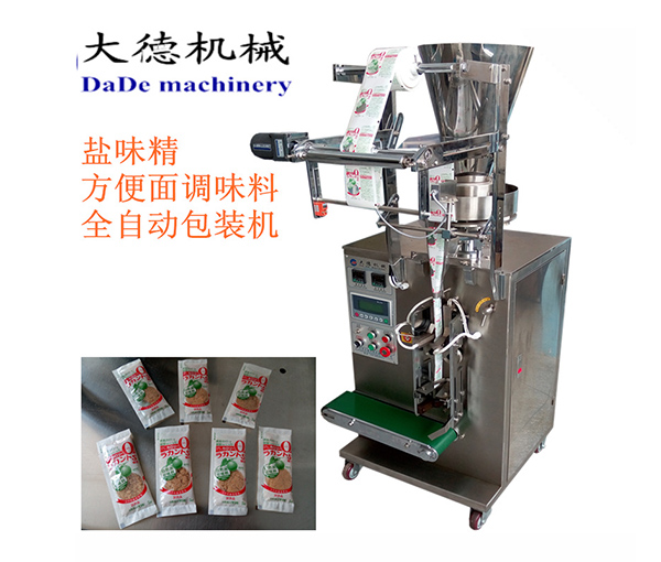 The machine can automatically complete processes such as metering, bag making, filling, sealing, cutting, printing production date, and easy-tear notching. It can be used for packaging various granular items, such as sugar, salt, MSG, chicken essence, glucose, desiccants, coffee, laundry detergent, beans, peanuts, etc.