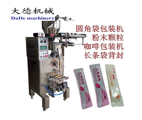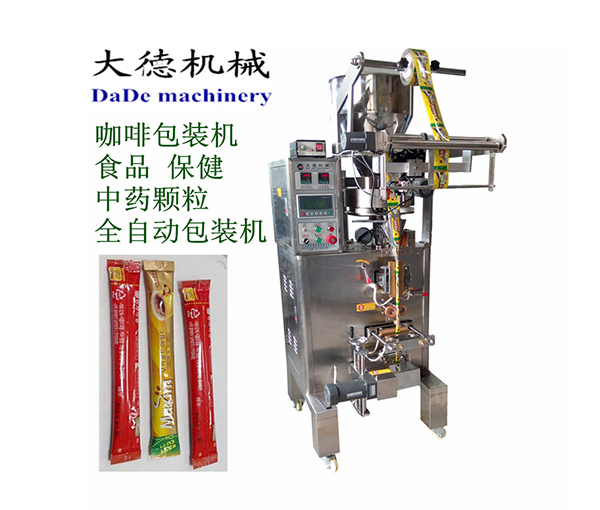 The machine can automatically complete processes such as metering, bag making, filling, sealing, cutting, printing production date, and easy-tear notching. It can be used for packaging various granular items, such as sugar, salt, MSG, chicken essence, glucose, desiccants, coffee, laundry detergent, beans, peanuts, etc.